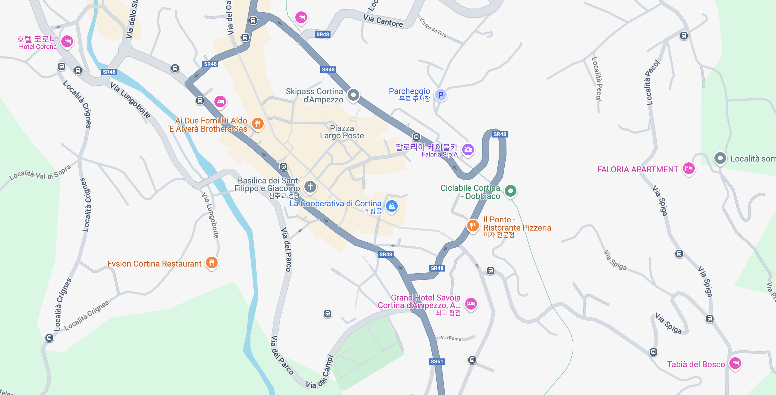 위에서 말했듯이 코르티나 써있는 다리 가는 길에 있고, 마을이 작아서 충분히 걸어갈 수 있다.