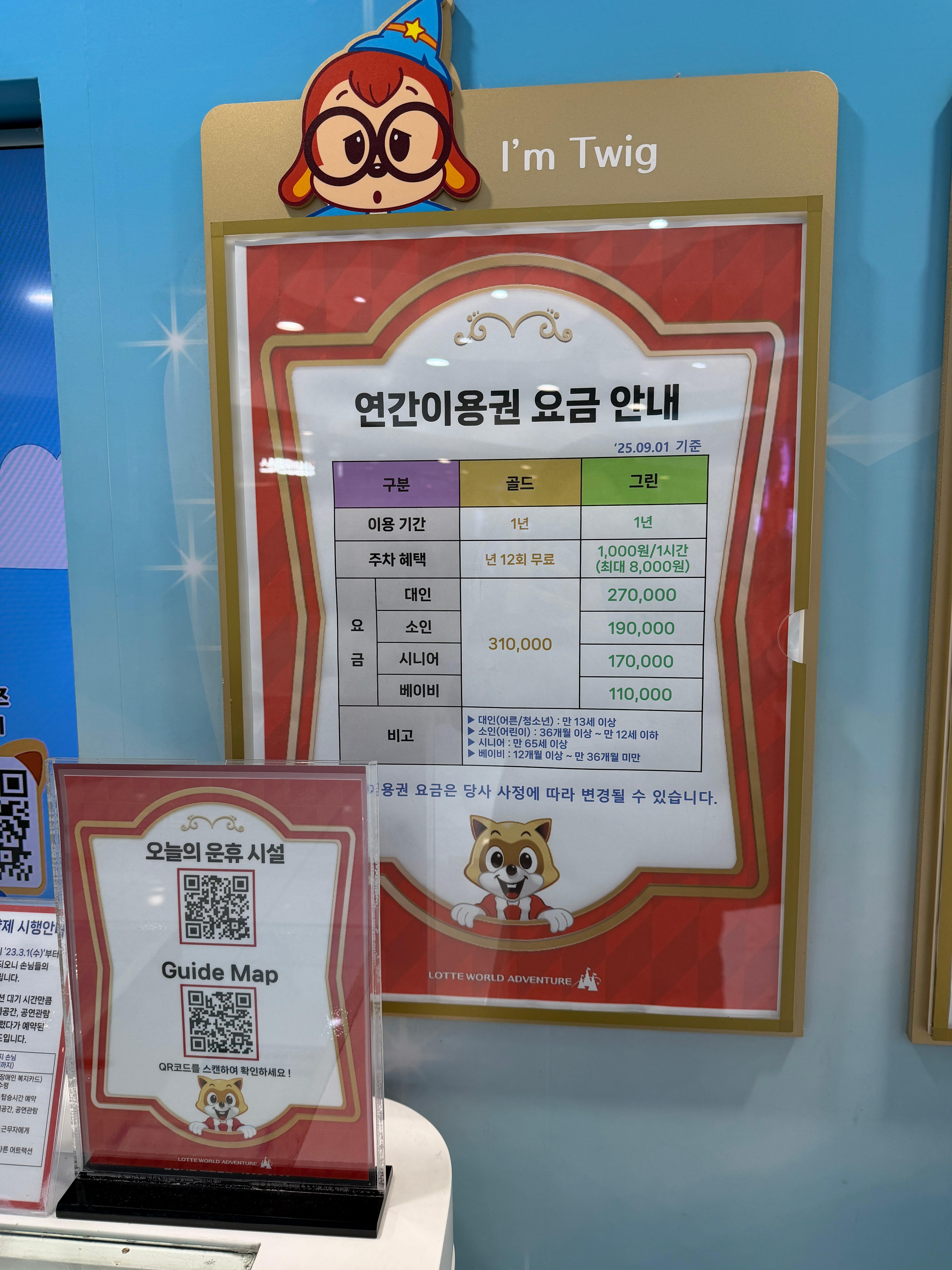 주차 안내는 그린 기준 1시간 1천원! 최대 8시간 즉 8천원까지 가능하다. 롯데월드 내에서 영수증으로도 추가 무료주차를 받을 수 있다. 마트나 백화점 주차로도 가능하다는 사실.